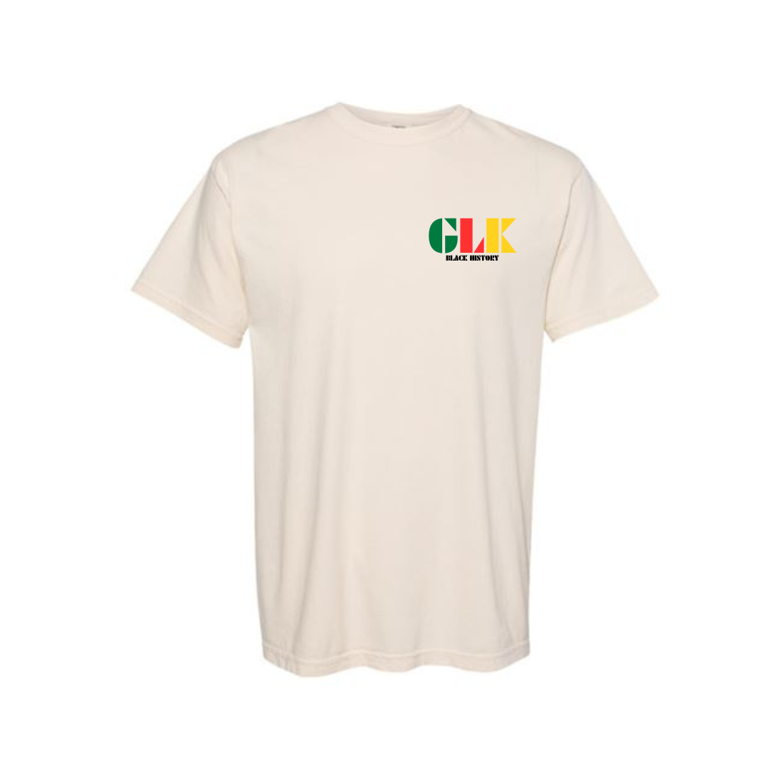 Our Girls Love Kick Black History abbreviated design is placed on the front left side with the bigger design placed on the back. The design colors green, red, and yellow. This item is in unisex sizing. If you would like a more fitted look, go down a size.