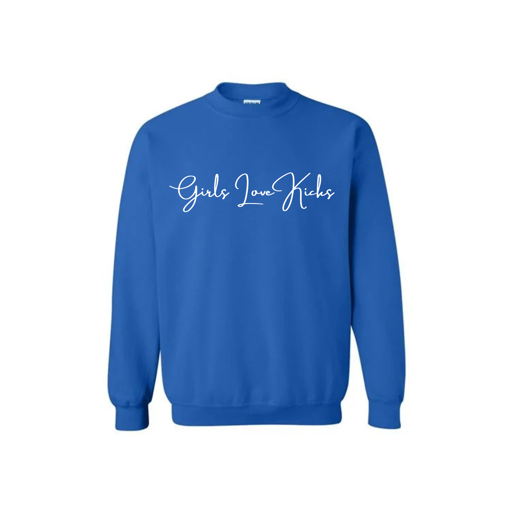 Our Girls Love Kicks Cursive Logo is placed on the front. This item is in unisex sizing. If you would like a more fitted look, go down a size.
