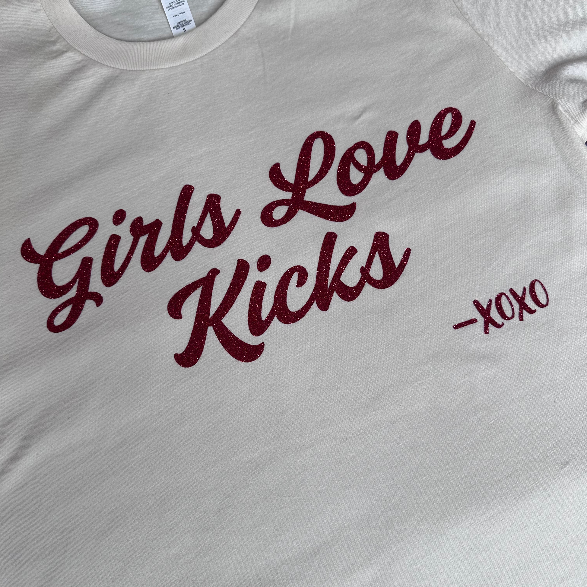 GLK (XOXO) design is made with glitter material. The design color is red. This item is in unisex sizing. If you would like a more fitted look, go down a size.